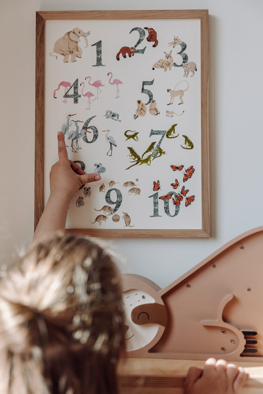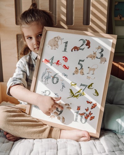 Zawiera podstawowe literki alfabetu, a przy nich zwierzątka, których nazwy zaczynają się na literki obok nich. Oprócz walorów edukacyjnych, to też niewątpliwie piękna dekoracja pokoju dziecka.