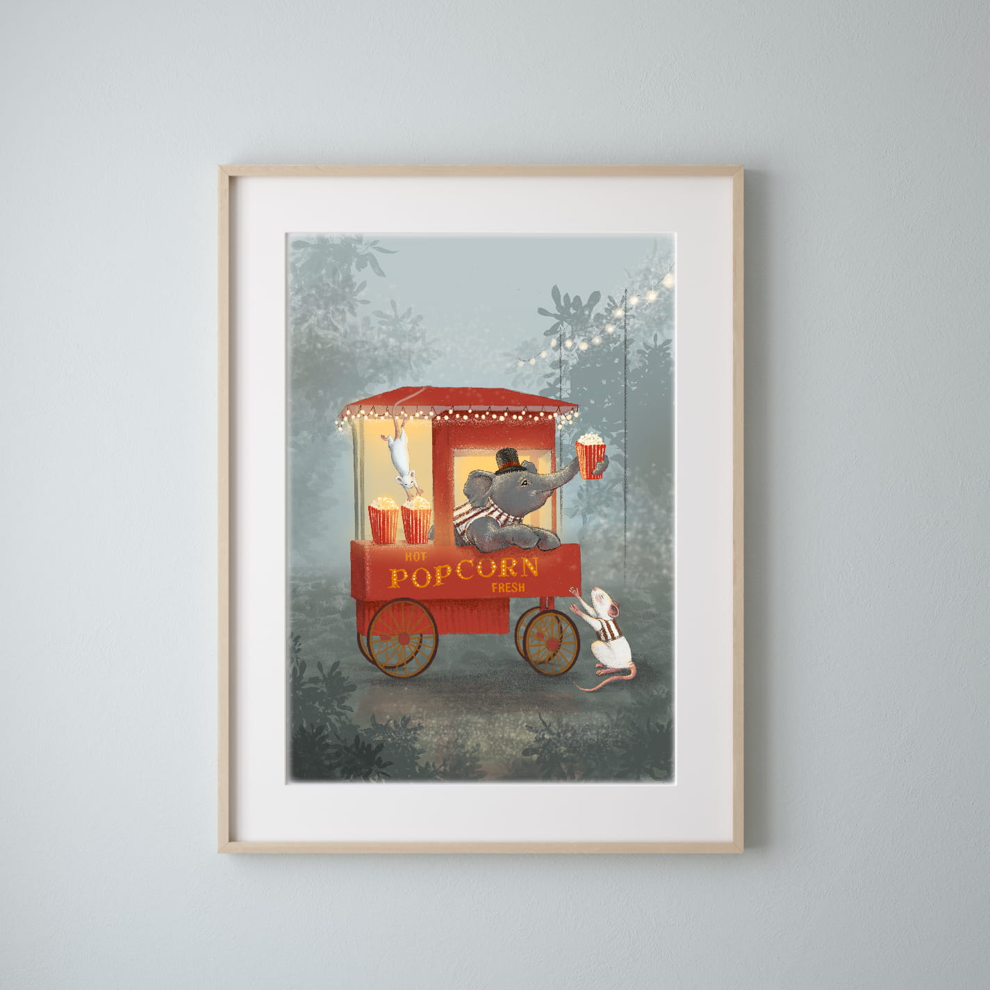 Plakat, który skradnie serca zarówno dzieci, jak i dorosłych! Przedstawiamy uroczego słonika wraz z mysią pomocnicą, sprzedających popcorn w chłodny dzień. To prawdziwa gratka dla miłośników magii i przygód!