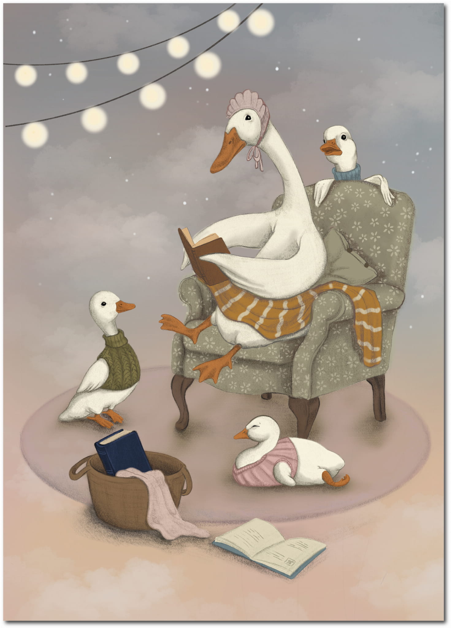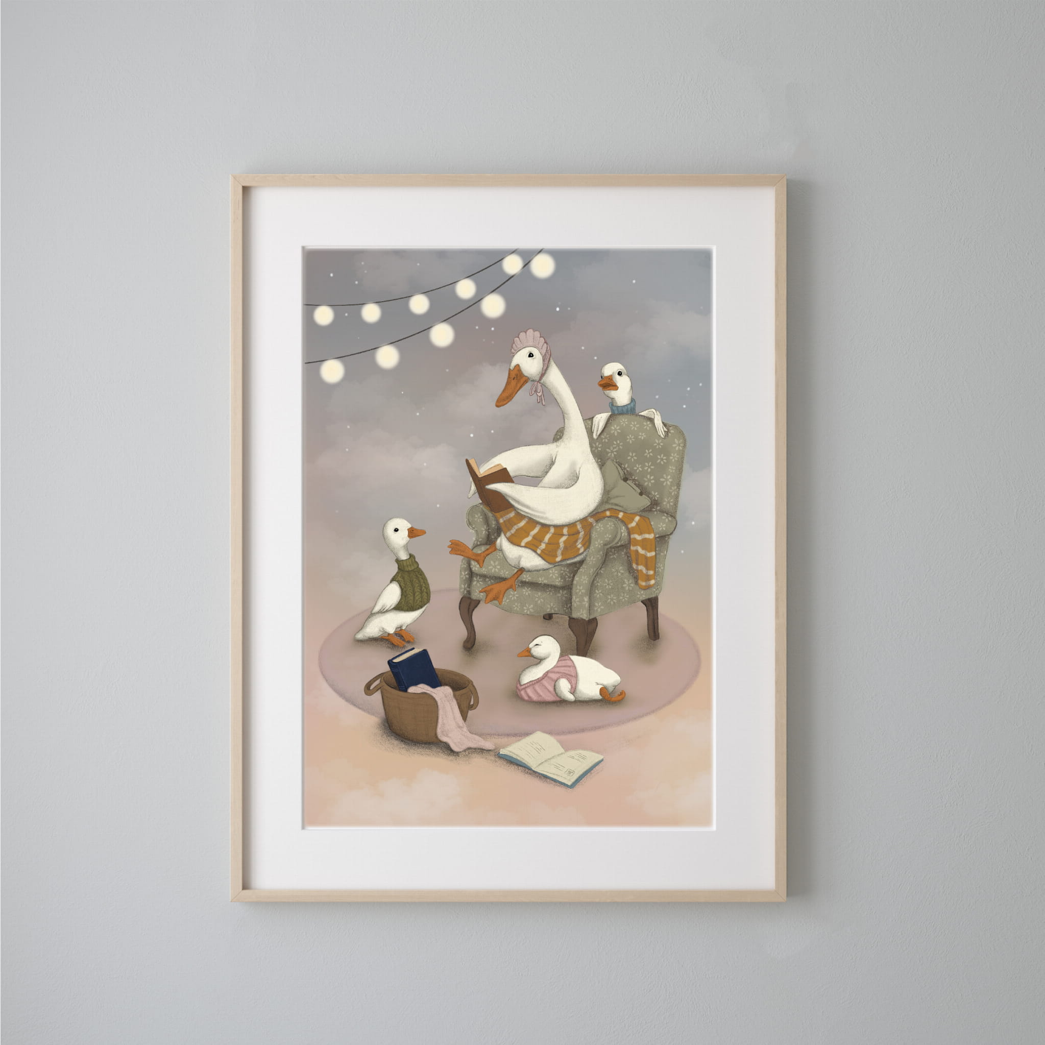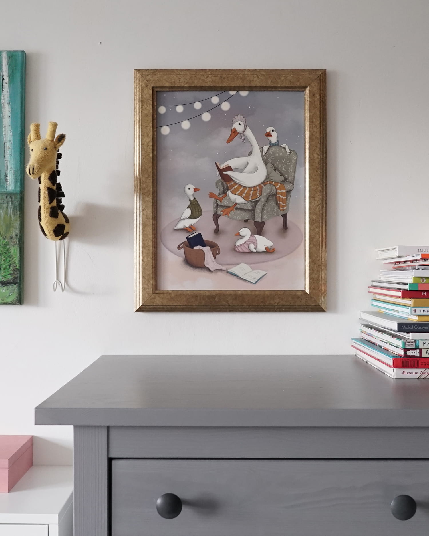 Zapraszamy do magicznego świata dziecięcych marzeń z naszym uroczym plakatem Little Geese. Mama czytająca dzieciom książkę idealnie wpasuje się w każdy przytulny kącik malucha.