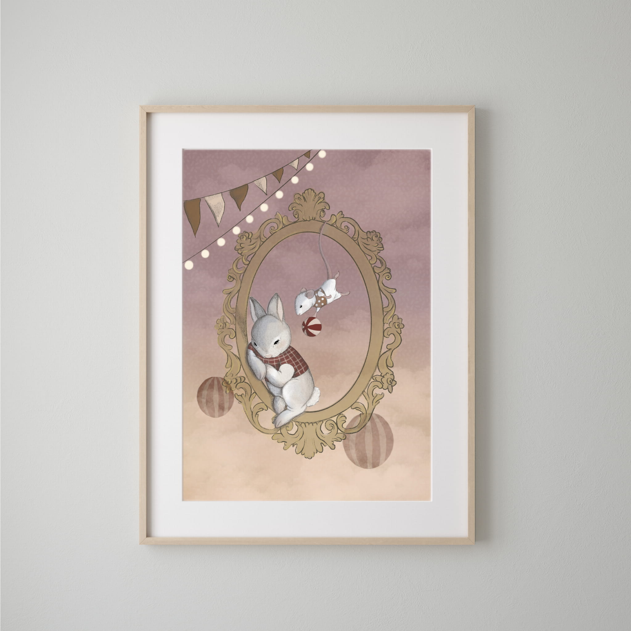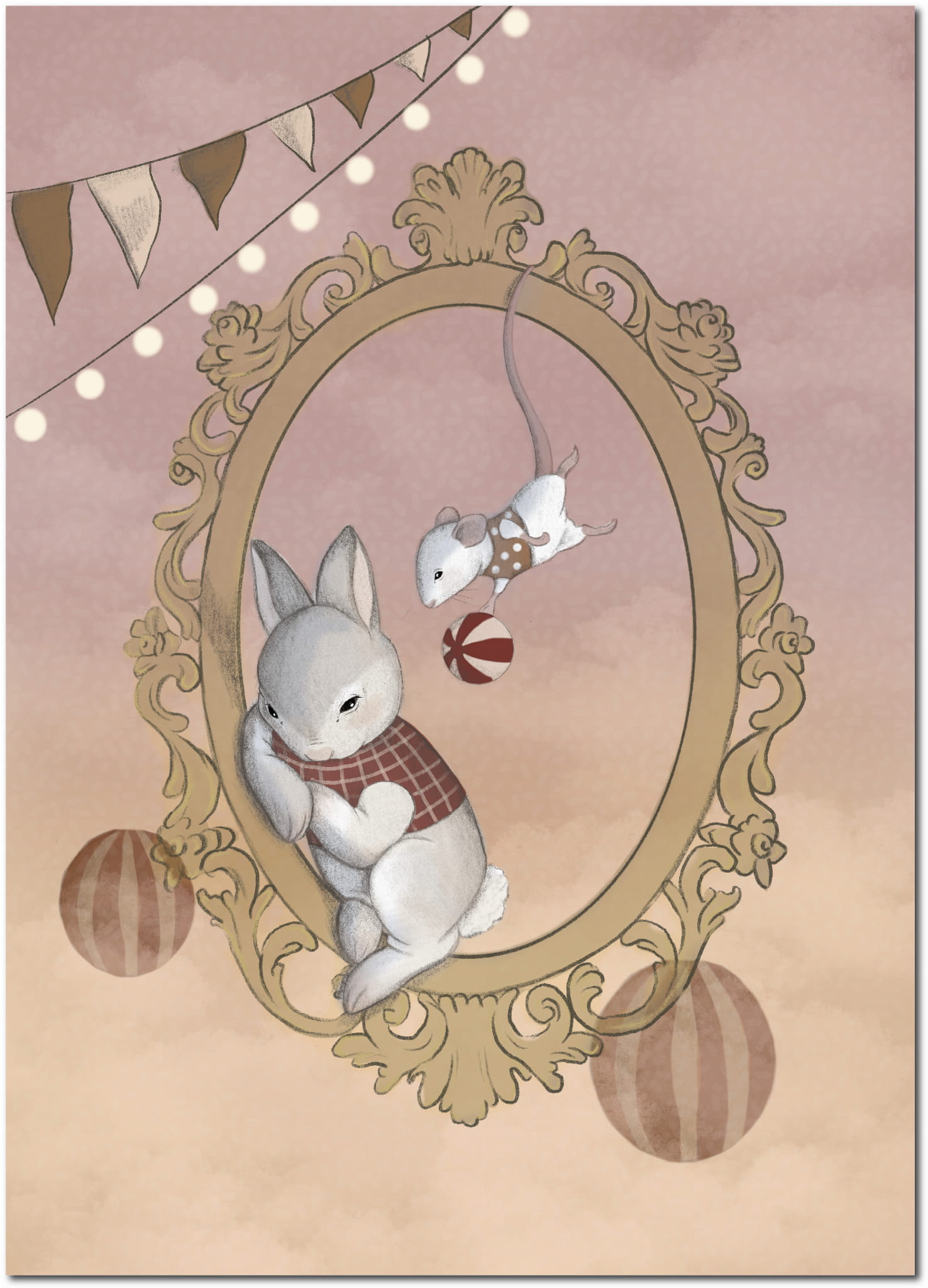 Plakat z uroczym króliczkiem i myszką w złotej, ozdobnej ramie, w otoczeniu pastelowych barw i delikatnych dekoracji. Doskonały do pokoju dziecięcego.