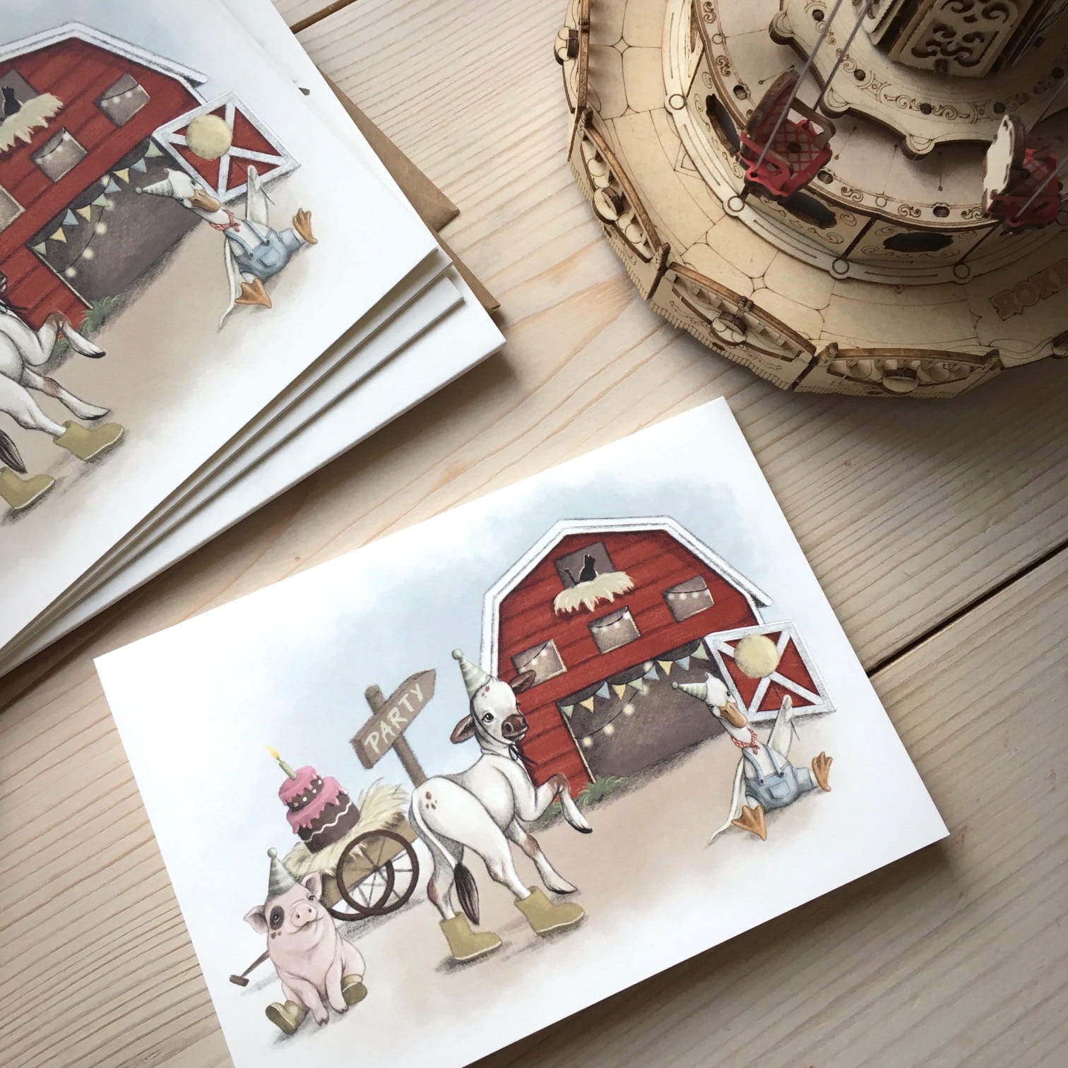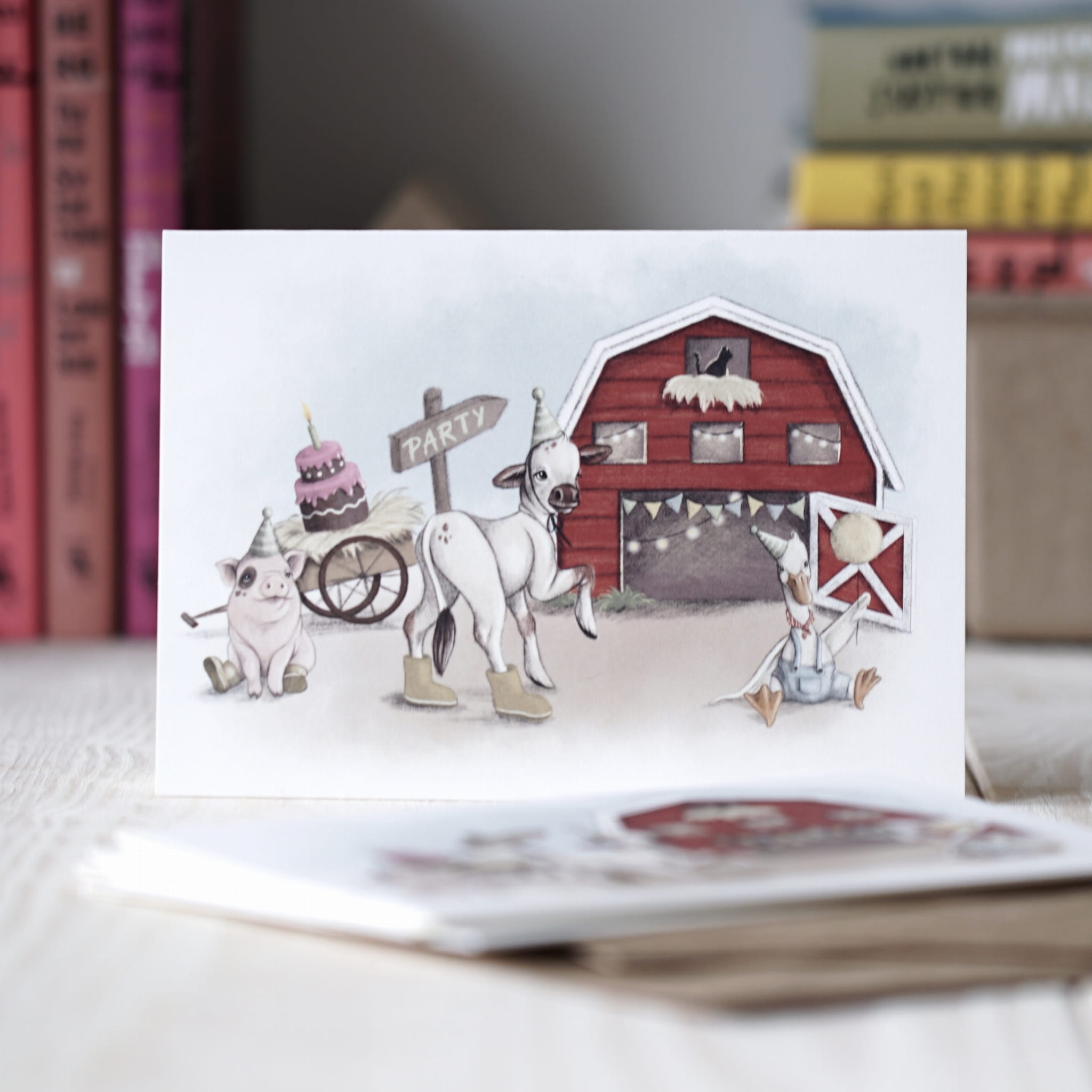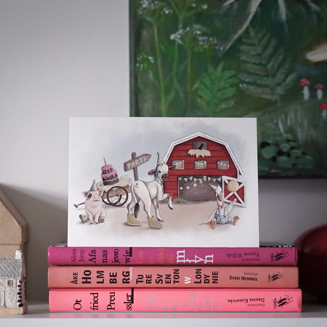 Zaproszenie urodzinowe dla dzieci z czerwoną stodołą przyozdobioną urodzinowo z różową świnką i piękną krówką z tortem.