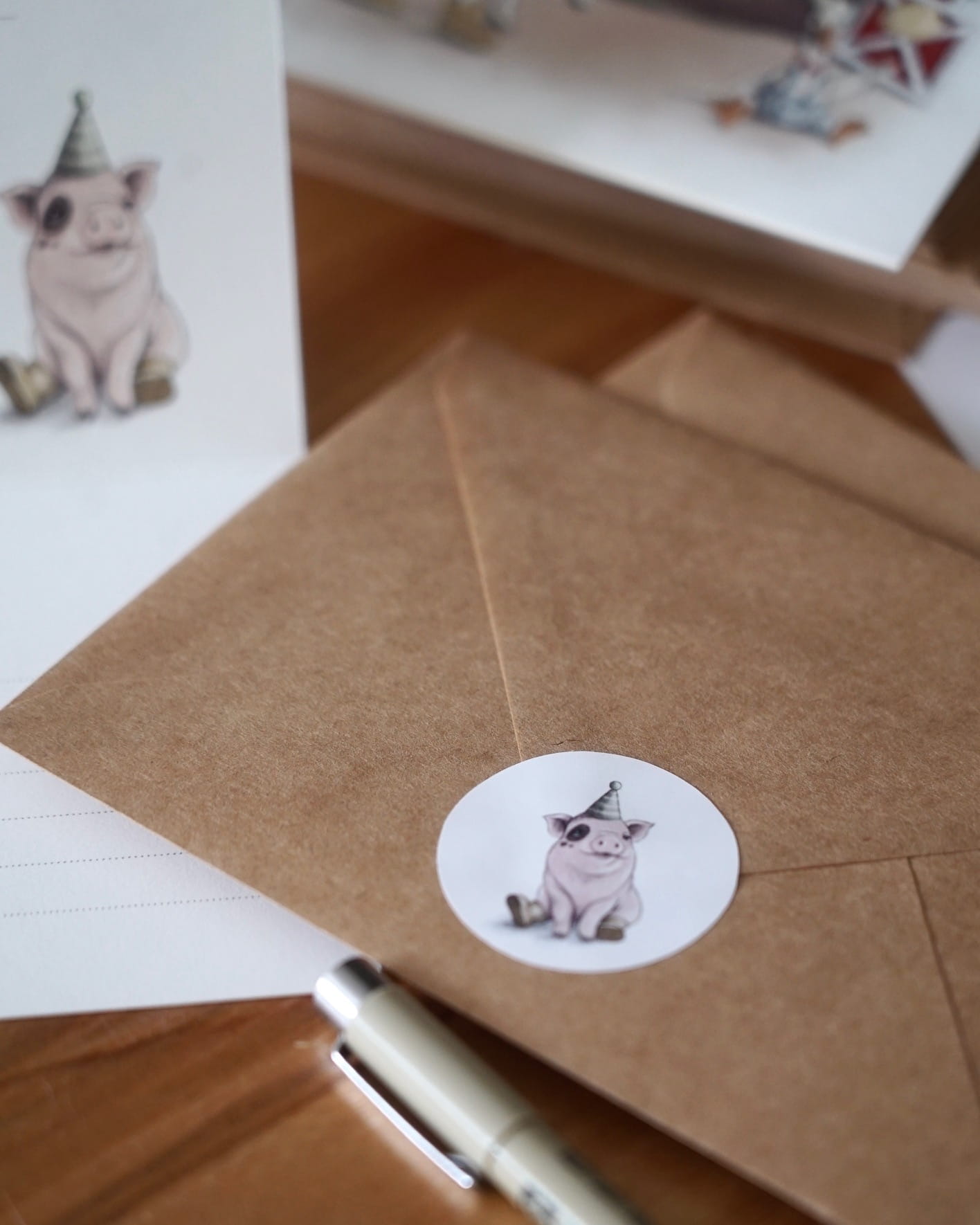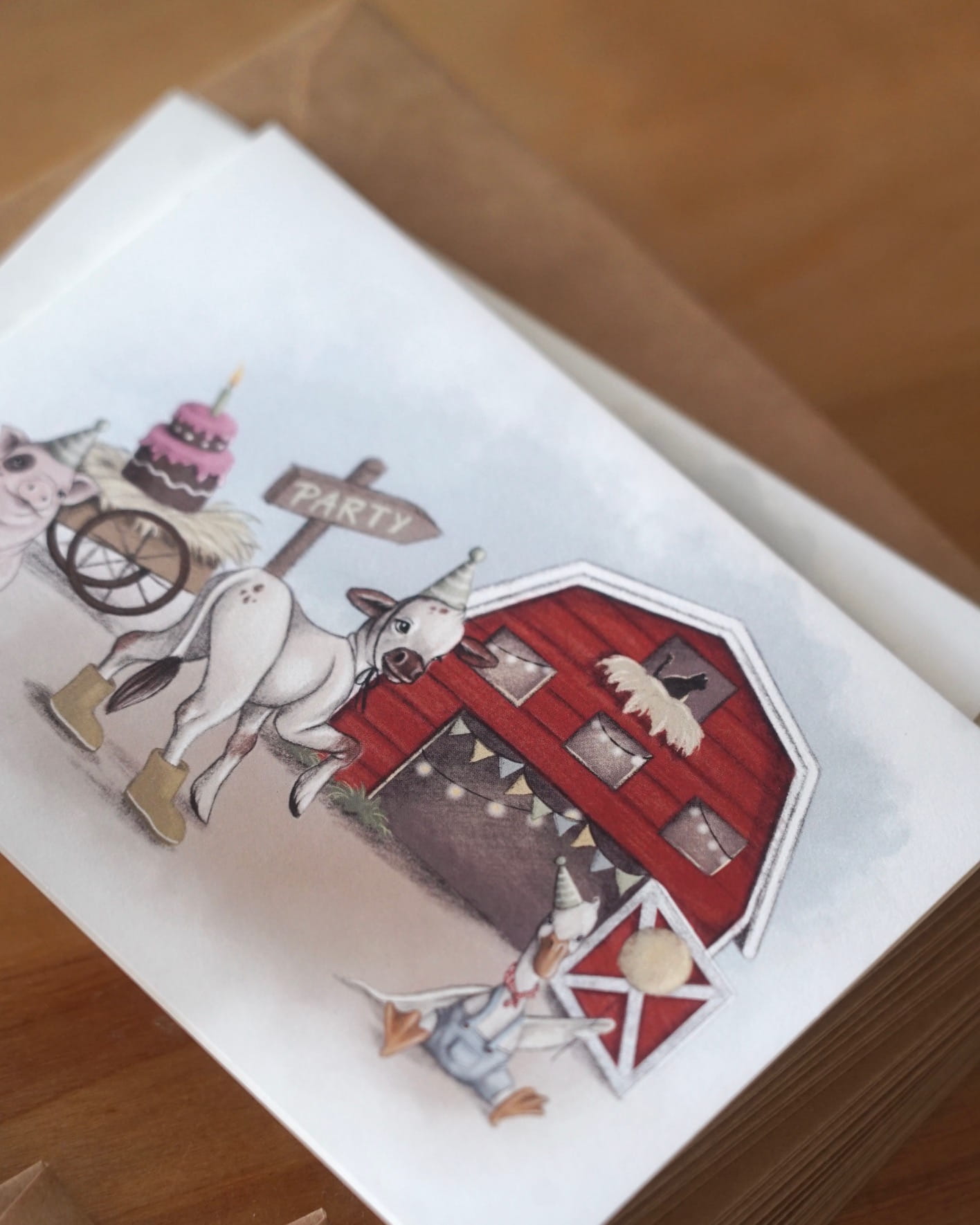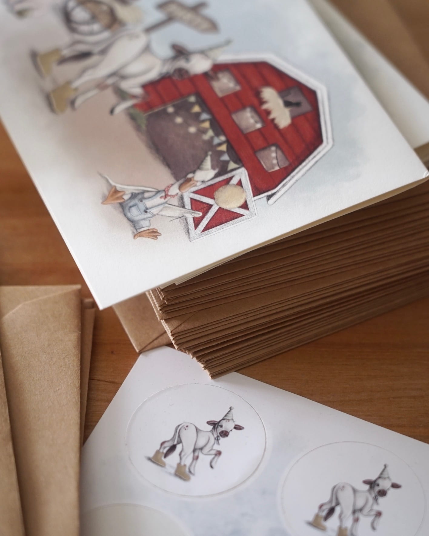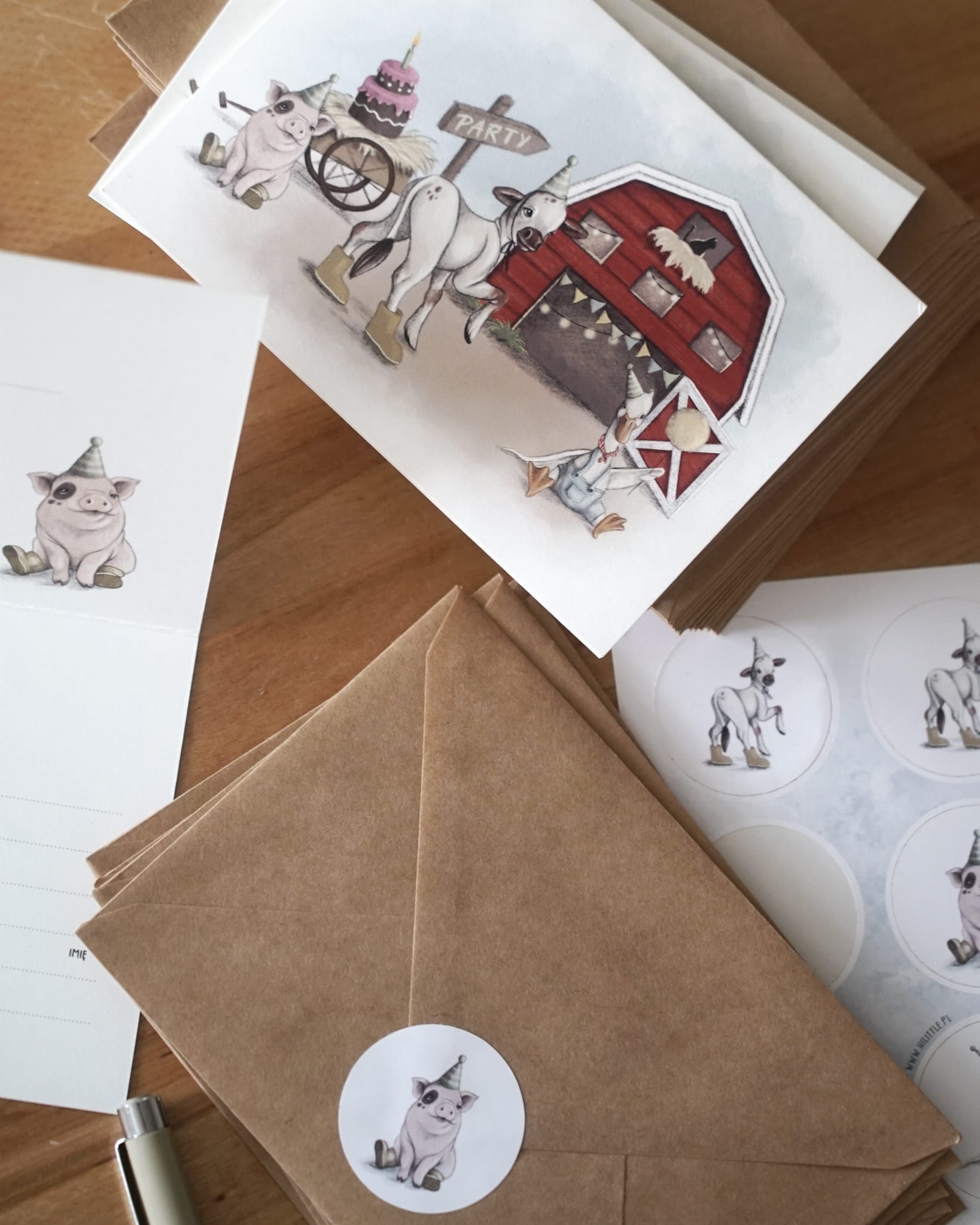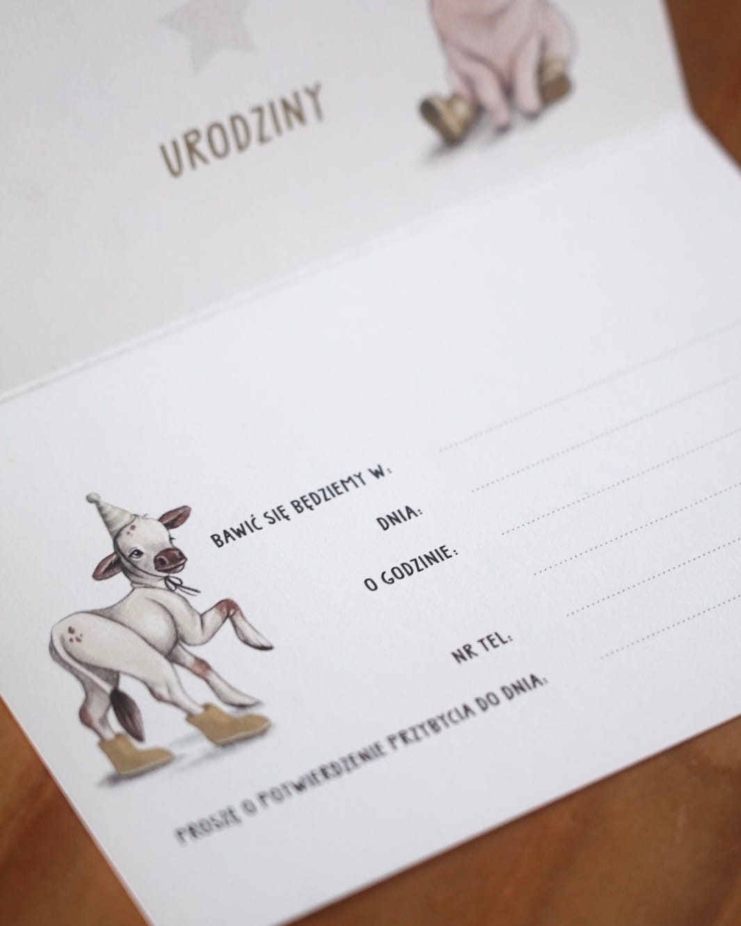 Możesz dokupić też bileciki do prezentów oraz naklejki do zaklejania kopert ze zwierzątkami z zaproszeń: świnką, krówką i kaczorkiem. Ale mamy jeszcze kartkę urodzinową, na której dodatkowo jest owieczka TU